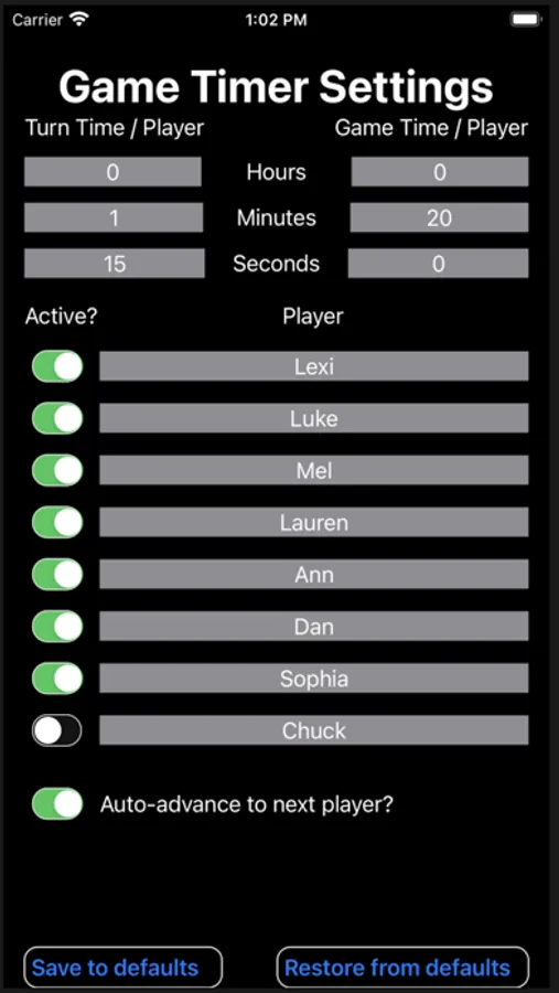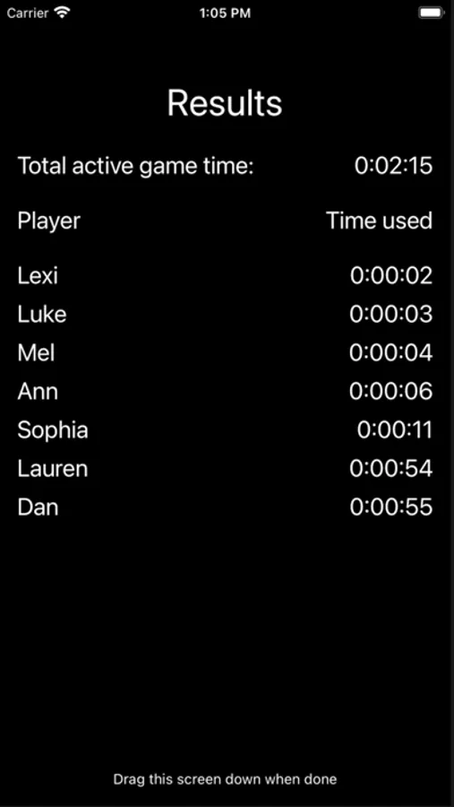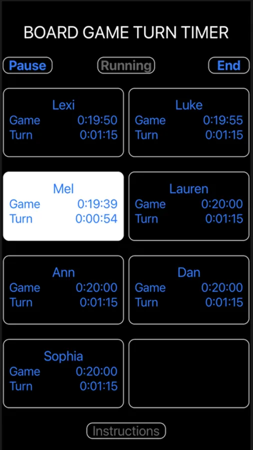 1-8 person timer that counts down both turn time and game time. Simple Start / Pause / End buttons plus a Settings page to let you set time limits and player names, along with the ability to save these as defaults for another playing time.