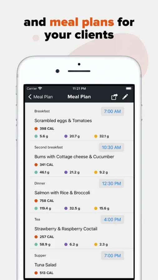 - Export your meals, diet plans and shopping list to a PDF and send to your clients