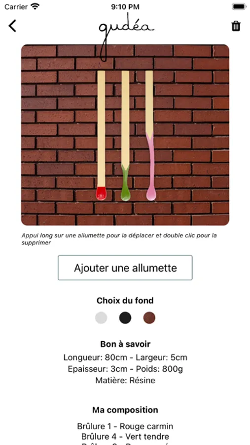 Fruit de plus de 14 années de travail autour du concept artistique des « mur d’allumettes brûlées » JG propose aujourd’hui la première sculpture interactive entre virtuel et réel. Sa série à succès est donc aujourd’hui proposée sous la forme d’un jeu qui consiste à choisir ses formes de brûlures associées à des couleurs Pantone limitées à 17 brûlures et 10 couleurs de la 11 génération de cette serie de sculpture murale. L’œuvre virtuelle ainsi obtenue est doublée d’une possibilité d’exécution matérielle en résine peinte par l’artiste sous la forme d’une commande avec un délai d’exécution.