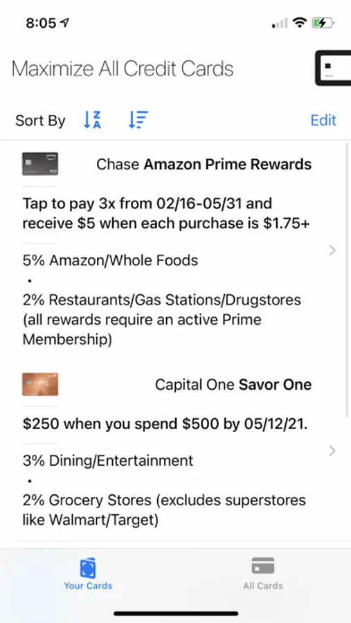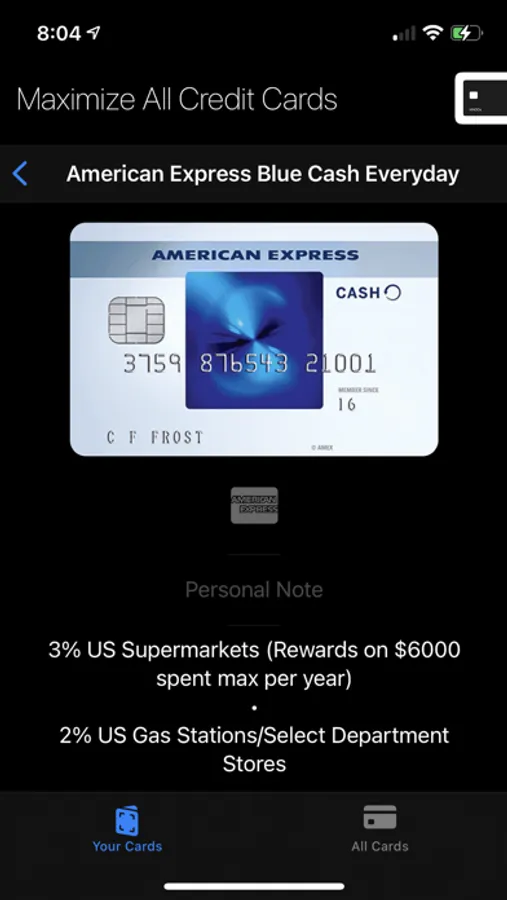 MACCs ("Max") is a credit card reference app that aims to promote thoughtful and responsible spending habits through free information. Take notes on your credit cards, track rewards and benefits, or discover cards best suited for you.