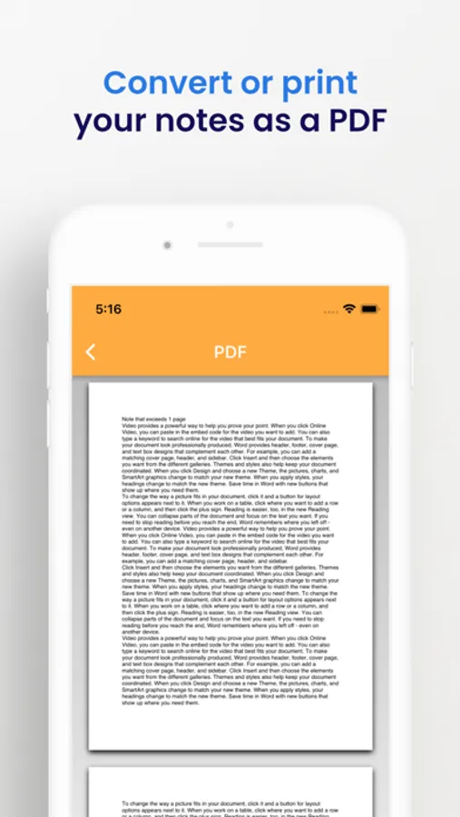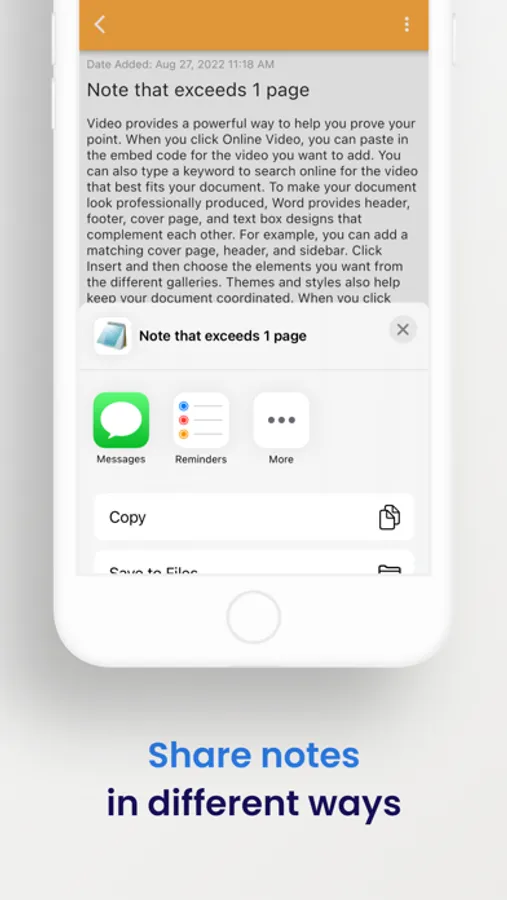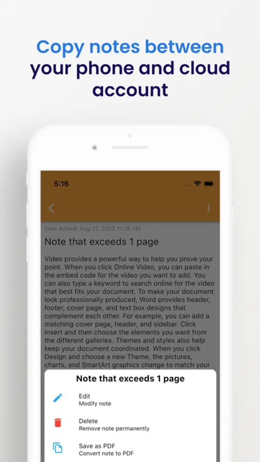This is just your good old plain text notes - no fancy videos or pictures, just text. Store your notes locally on your phone or create an account to store notes on the cloud and access it from your other non-iOS devices. You can then copy notes between your local notes and your cloud notes.