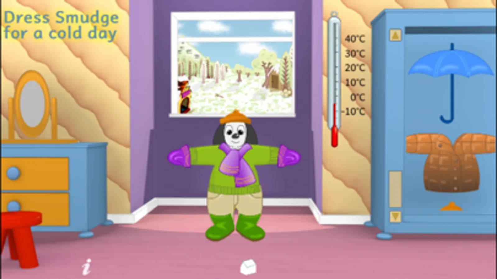 Smudge has a whole wardrobe full of clothes. Children can scroll through the wardrobe and select suitable items for the weather conditions and drag them onto Smudge. When all the items for the type of day have been put on Smudge, she will perform a rain dance, drink her cold drink or shiver in the cold! There is help which shows the items Smudge still needs to put on for this type of weather.