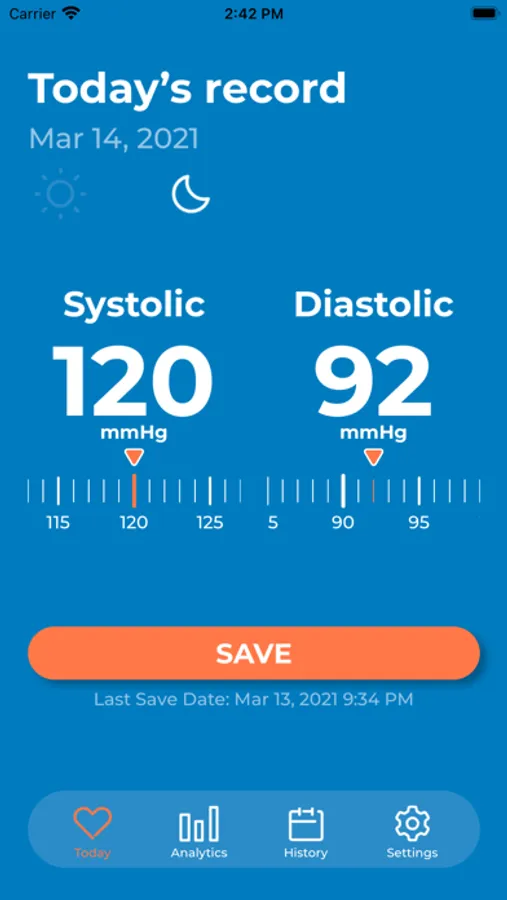 On the "Today" screen, you can easily record blood pressure and save time by moving the slider left and right to set the systolic blood pressure and diastolic blood pressure, and tapping the save button!