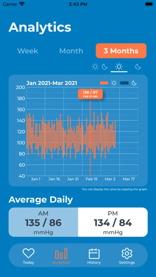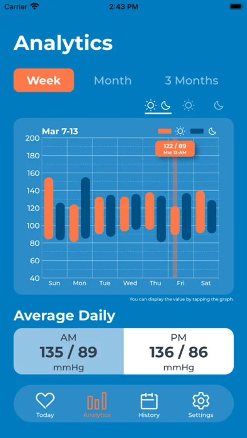 On the "Analysis" screen, a graph of weekly, monthly, and 3-month blood pressure is displayed. Blood pressure values are the average of the morning and night of the day. In addition, the average blood pressure during the display period of the graph is displayed. You can check the data by tapping the graph. By tapping the mark on the upper right of the graph, you can switch between morning and night blood pressure display, morning blood pressure display only, and night blood pressure display only.