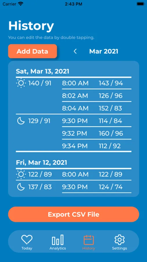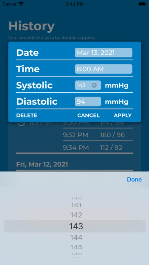 On the "History" screen, the blood pressure record for the year and month selected in the upper right corner of the screen is displayed. You can correct the blood pressure data by double tapping the data. If you forget to record the blood pressure data, you can add it by clicking the "Add" button on the upper left of the screen. When you tap the "Add" button, the input screen will be displayed. Select and add the date, time, systolic blood pressure, and diastolic blood pressure respectively.