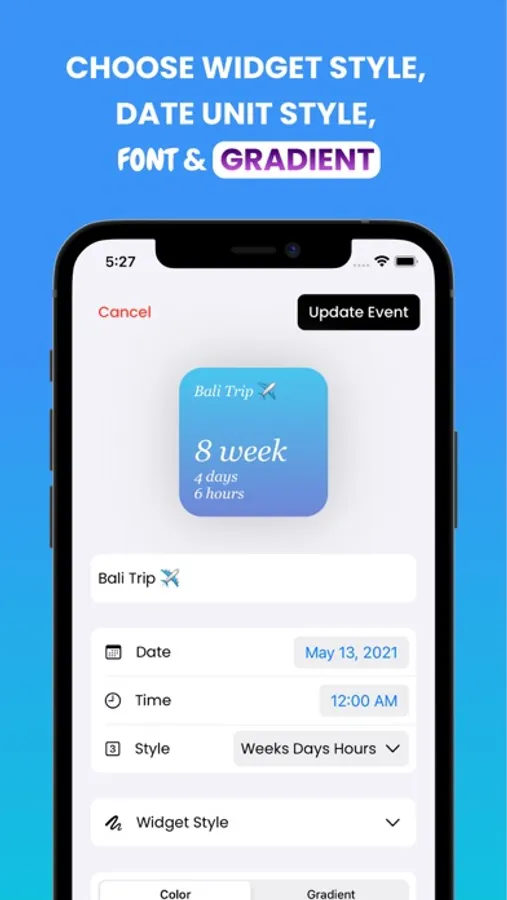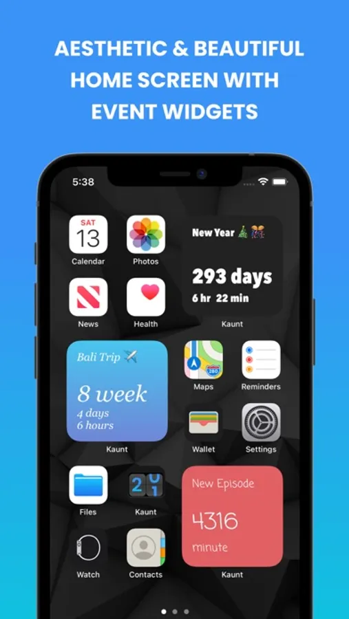 Your upcoming events, vacations, birthdays, anniversary and much more on your Home Screen with style. Create aesthetic and elegant widgets for your reminders, countdowns and ups with Kaunt.