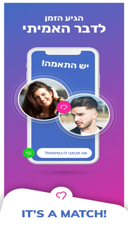 קבלתם התאמה ראשונה? מזל טוב! הגיע הזמן לעשות את הצעד הראשון ולעבור אל הצ'אט החדש שפיתחנו,מבטיחים לכם שהדרך אל הדייט הראשון קצרה מתמיד ואולי גם תמצאו אהבה אמיתית מעבר לפינה.