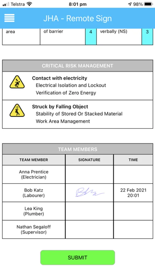 The 100% contact-free solution for signing your JSAs, JHAs and JSEAs.