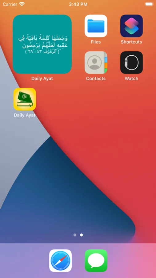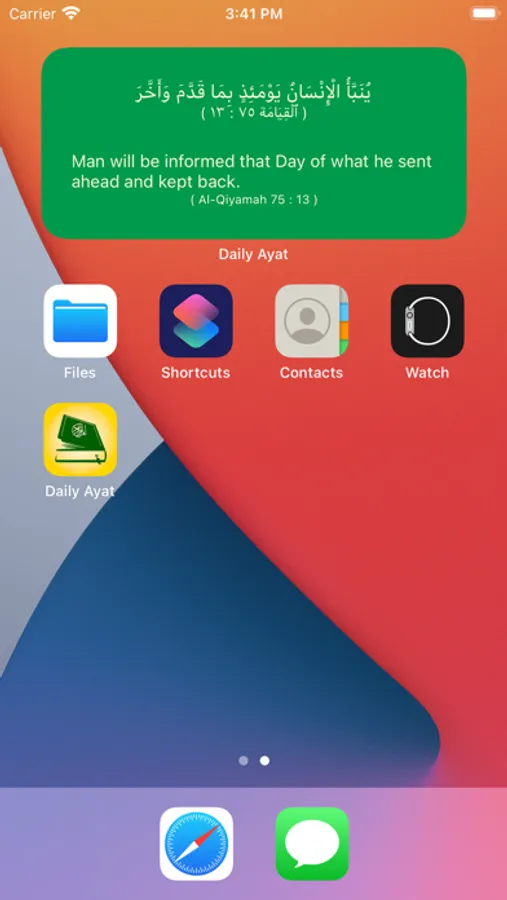 The widget can be set to show only the ayat or the translation or both. The widget appearance and update period can also be set in the app settings. Tap on the widget to go to the app.