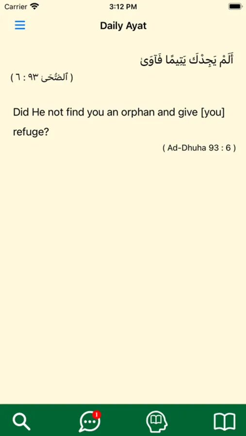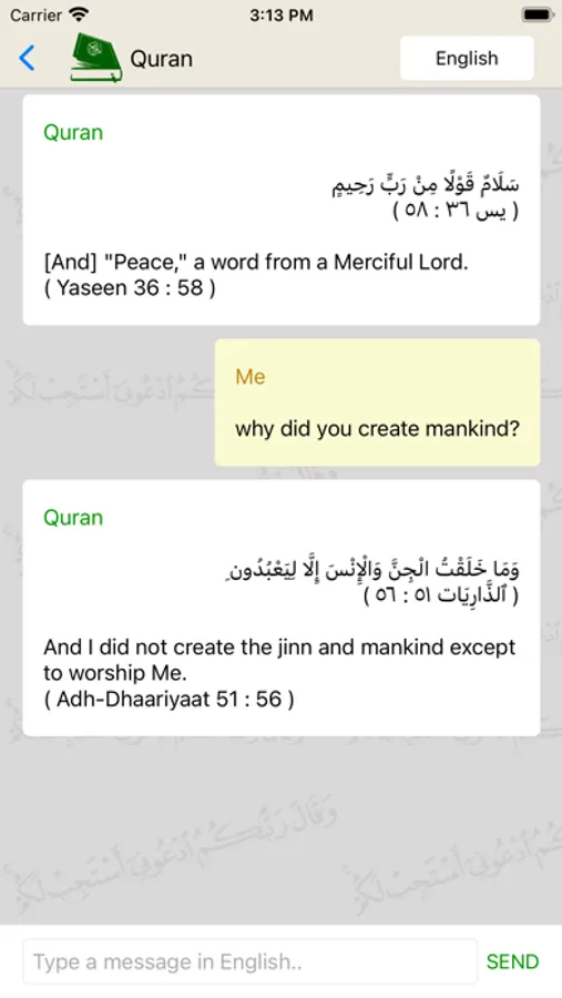 - The app has a Quran chat, where you can talk with Quran. When you send a text message, the Quran will respond to you with the most relevant verse. If no relevant verse is found, a random verse is displayed. In this case, the Quran label in the received message turns red. The text messages can be written in both Arabic or English.