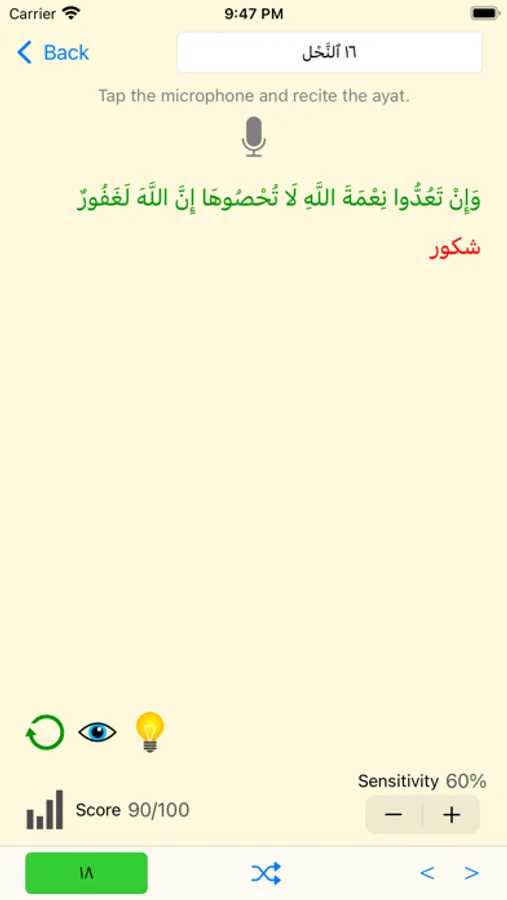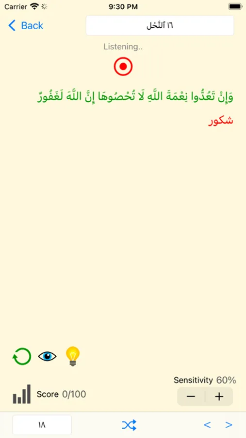 You can tap the random button to practice a random verse from Quran. In this case, the app will prioritise the verses that you have not tried yet. Next, it will prioritise the red flagged verses, then the orange flagged verses, and finally the green flagged verses. This way helps you first practice the verses that you are not good at.