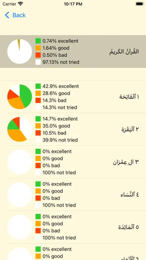If you were able to recite more than 90% of the words in a verse correctly, the verse is flagged as green. If you recited between 50% and 90% of the words correctly, the verse is flagged orange, and if you recited less than 50% of the words correctly, the verse is flagged red. Your memorization progress is also illustrated with charts.