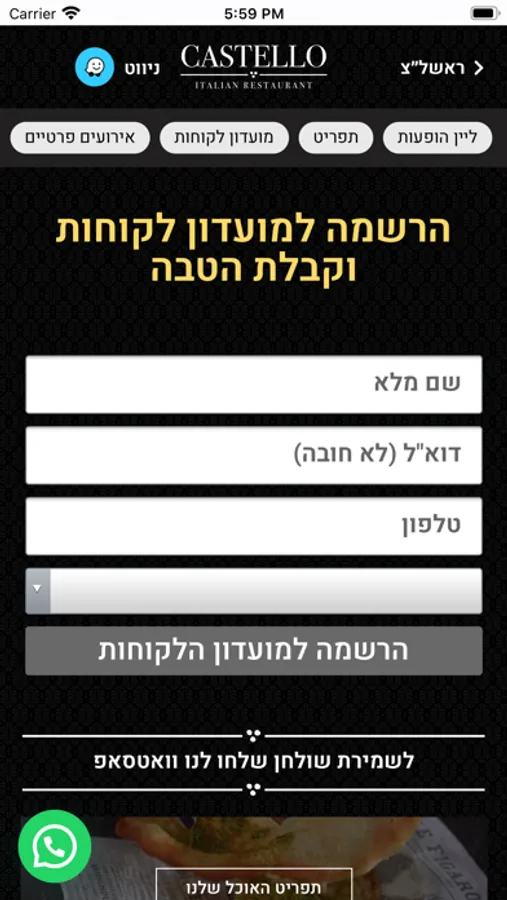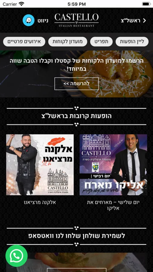 כיום מסעדת קסטלו שממוקמת במרכז ראשל”צ, לצד סניף נוסף בנמל ת"א. סניף ראשל"צ נמצא ממש מתחת לבניין העירייה, מציעה לאורחיה בילוי מלהיב במסעדה איטלקית כשרה, שהאווירה בה משתנה, אבל תמיד מהנה – בשעות היום תיהנו מאוכל מתגמל ואהוב ובערב נכנס לקסטלו וייב של בילויים עם מוזיקה טובה, קצב והרבה פאן. בכל שעה שתגיעו תזכו מאיתו לחוויה רבת טעמים ואטרקציות ולשירות אדיב.