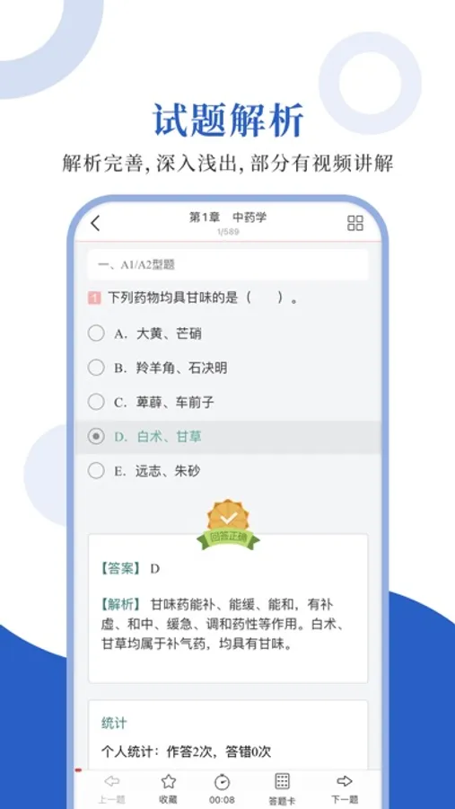 专为中药学职称考试精心准备的考试配套题库,每一道试题都有答案解析,为考试提供了充分的复习准备,可随时随地学习练习,支持手机、平板多端同时使用。