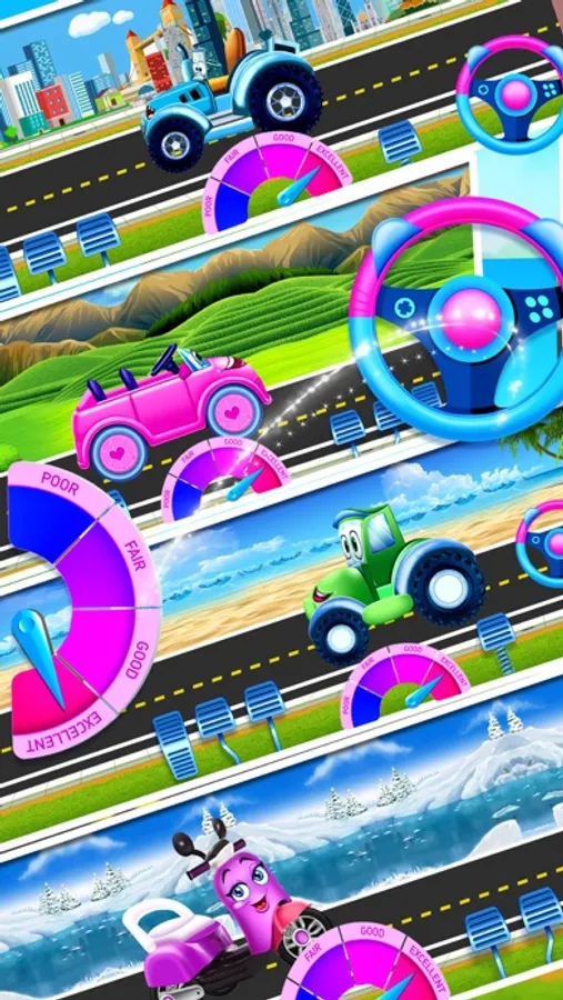 Each car has a different race landscape. Accelerate and turn wheels!