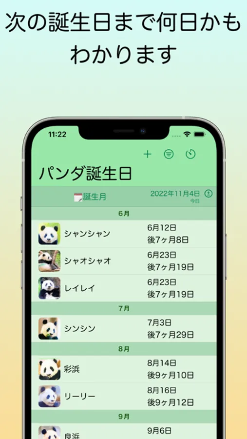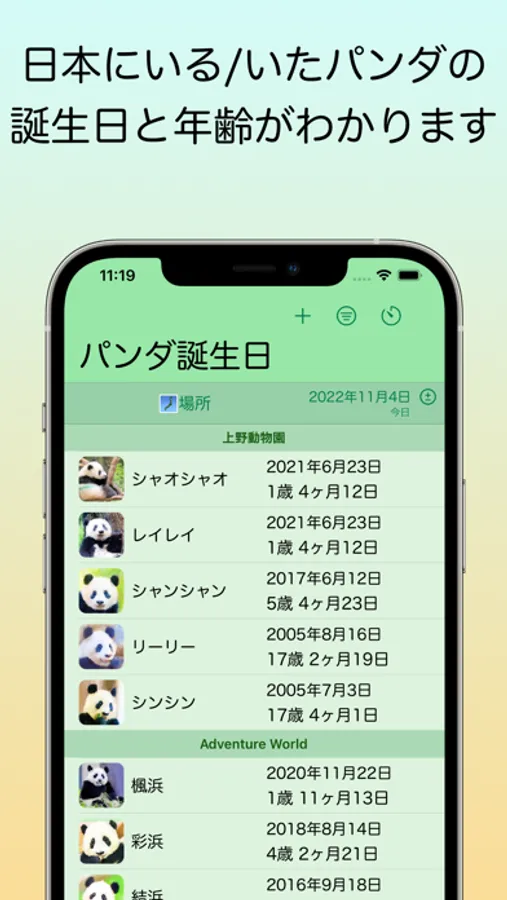 ・パンダの誕生日や年齢、次の誕生日までの日数などがすぐにわかる。
