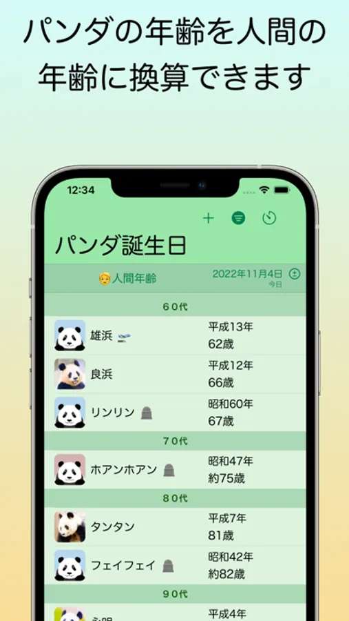 ・パンダの人間年齢に換算した年齢(実年齢の3倍)がすぐわかる。