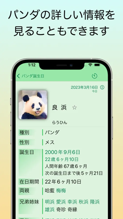 パンダの誕生日や年齢、性別、両親、出生地、現住地などを表示します。