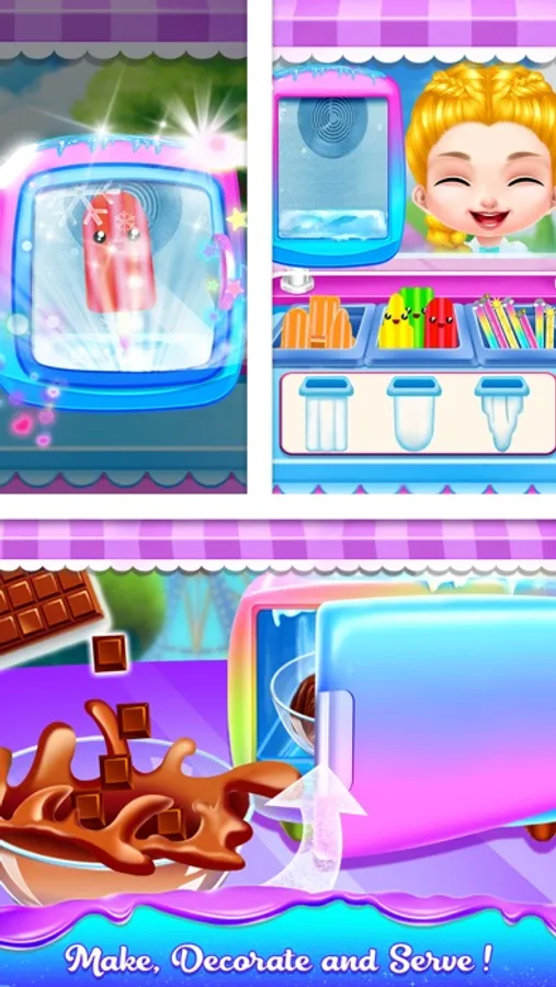 Its your turn to make all kinds of frozen desserts ice cream. From Popsicle to super 3 balls sundaes. Start game preparing ice creams with all ingredient. Cut Fruits and mix them to make ice creams.