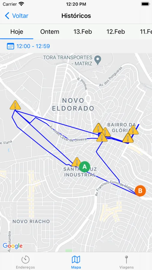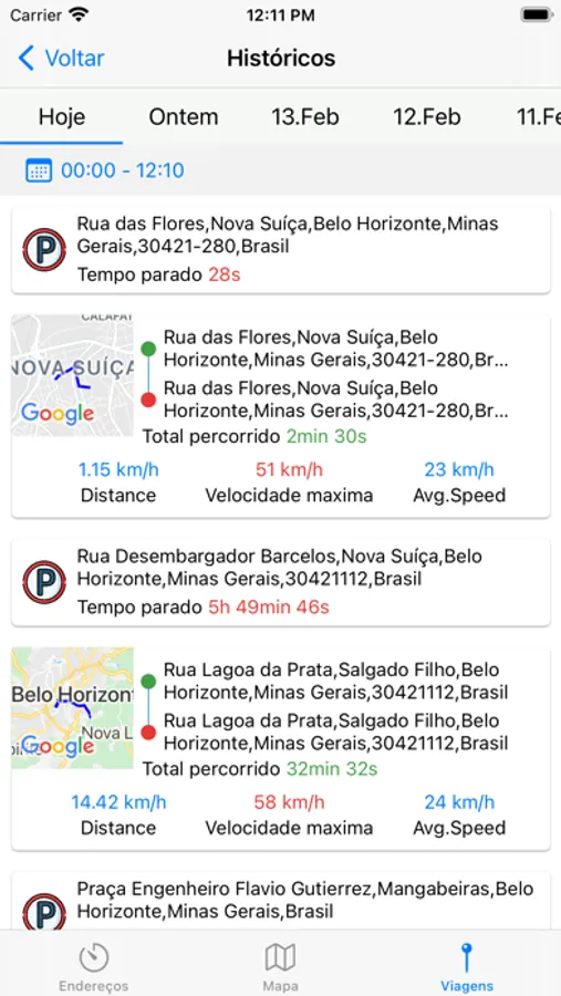 Você também terá acesso ao histórico de telemetrias, para saber a que momento os evento foram acionados.