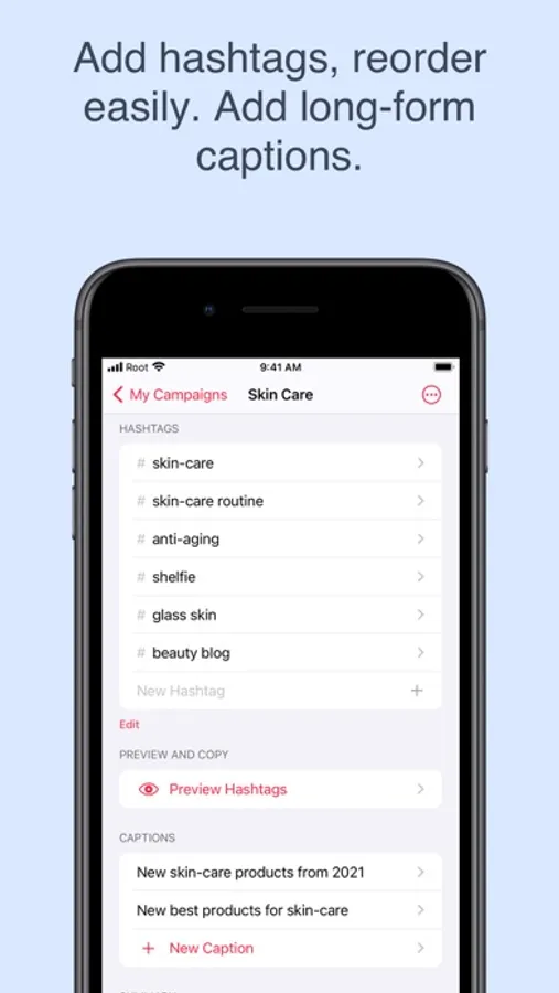 Add hashtags, mark them as favorite, reorder easily. Add long-form captions to campaigns.