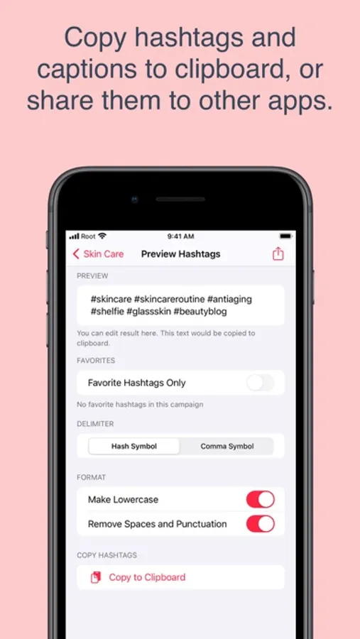 Quickly copy hashtags and captions to clipboard, or share them to other apps.