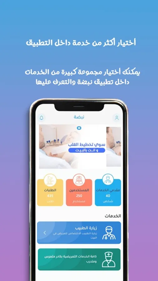 تطبيق نبضة هو تطبيق متخصص بالرعاية الطبية المنزلية يقدم كافة الخدمات الطبية للمريض في البيت باسرع وقت وافضل جودة