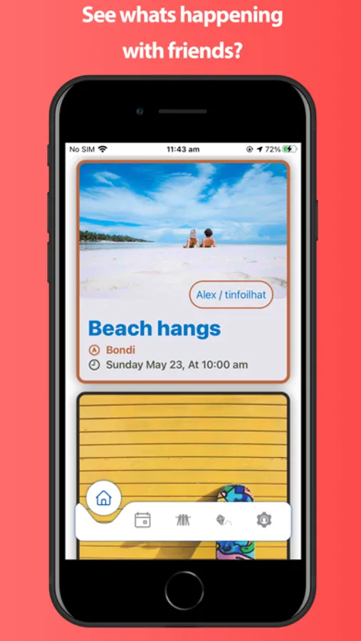 Create customised events in under a minute by selecting an event photo, time, place and invitees to instantly notify your friends that you're available. Friends can opt-in or out with the click of a button and post on the event message board.