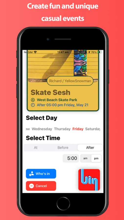 Create, organise and design fun and unique CASUAL EVENTS with friends and keep up to date on your friends’ fun activities. A one-stop-shop to organise, post casual events, invite your friends to OPT in, message, photo share, and organise meetups! – Uin?