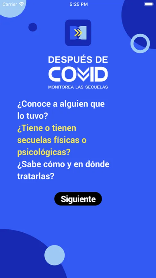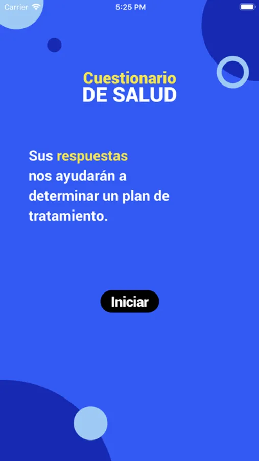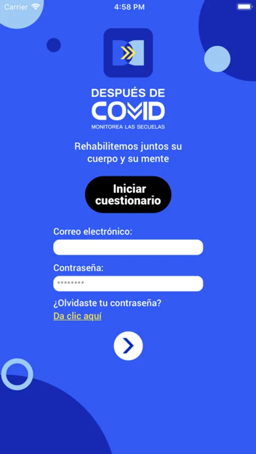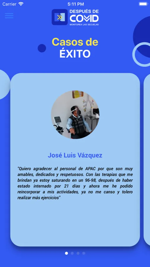 La aplicación móvil trabaja a través de cuestionarios de salud y de datos generales que el usuario responde según su situación personal. El usuario puede visualizar sus citas con los diversos especialistas, el tratamiento asignado, así como el cumplimiento de sus metas. El usuario tendrá disponible una sección con sugerencias generales (videos y textos) que podrá consultar sin restricciones.