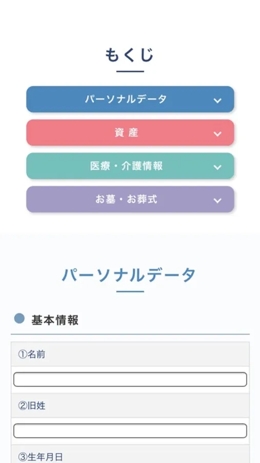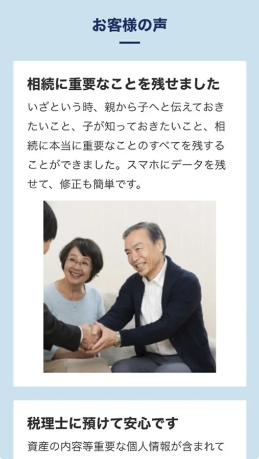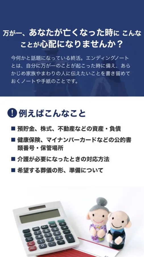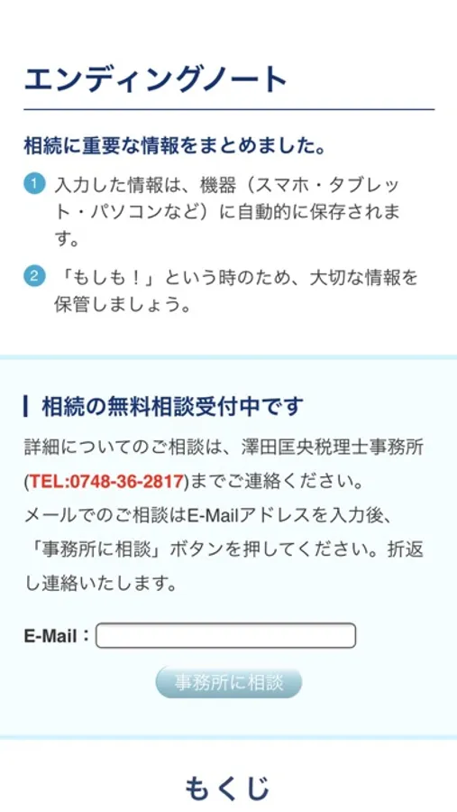 自分に万が一のことが起こった時に備え、あらかじめ家族やまわりの人に伝えたいことをスマホに書き留めておく事ができる税理士事務所がつくったアプリです。
