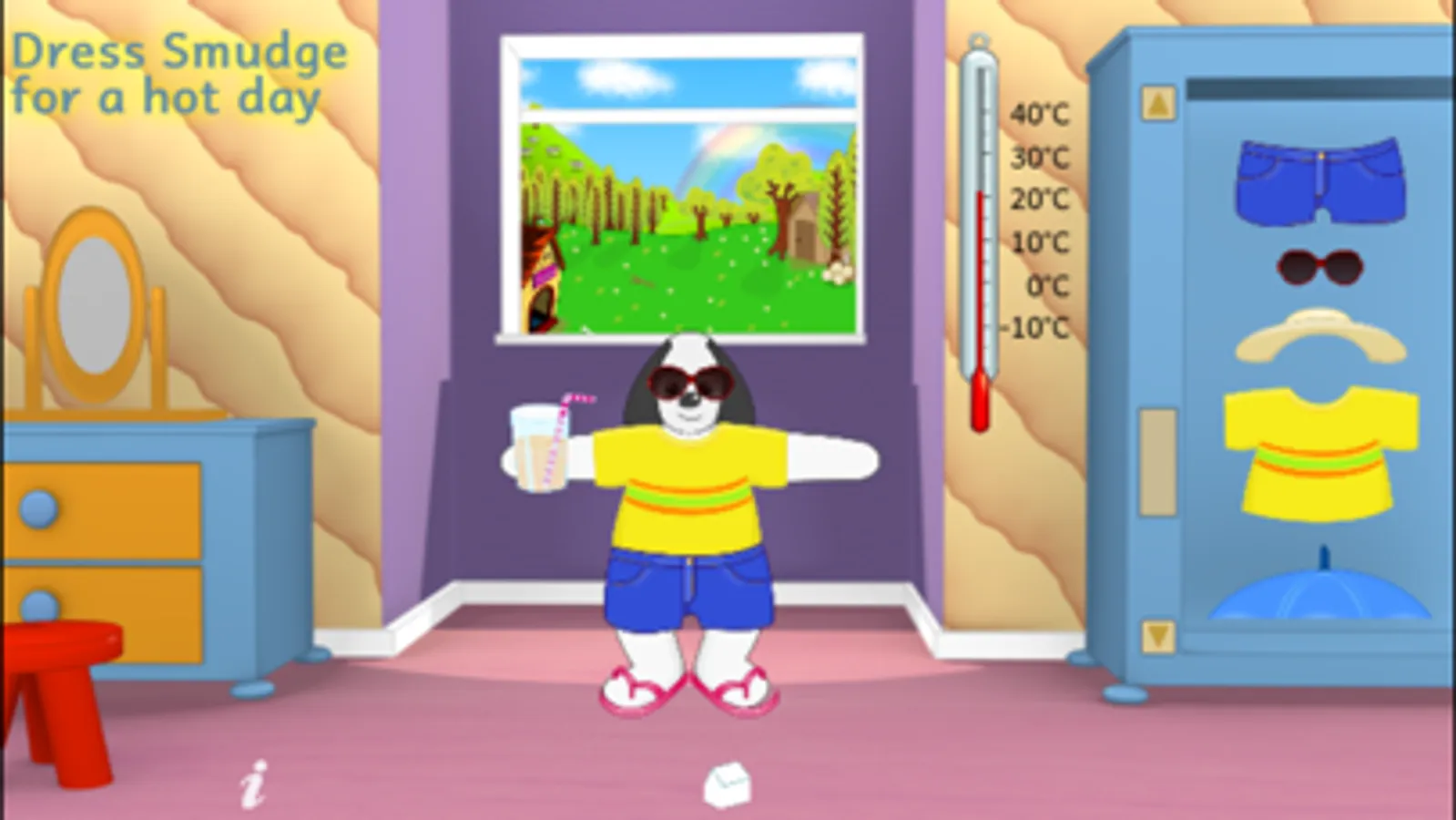 Smudge has a whole wardrobe full of clothes. Children can scroll through the wardrobe and select suitable items for the weather conditions and drag them onto Smudge. When all the items for the type of day have been put on Smudge, she will perform a rain dance, drink her cold drink or shiver in the cold! There is help which shows the items Smudge still needs to put on for this type of weather.