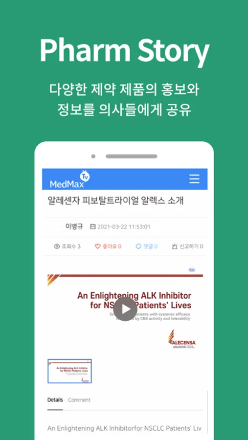 제약회사에서 홍보 중인 제품들의 영상 자료나 기타 의약품 정보들을 의사들에게 공유하고 제품별 피드백을 서베이 형식으로 받아 볼 수 있는 서비스입니다.