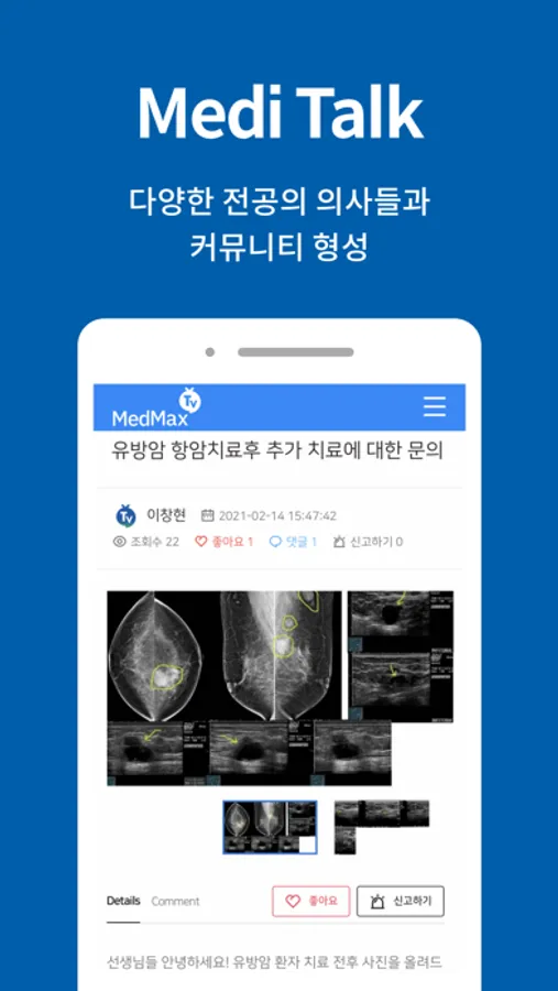 의사들이 자유롭게 글을 쓰고 자신의 고민사항 및 실시간 의료업계의 이슈들에 대해서 논의하는 영역이며, 다양한 전공의 의사들과 커뮤니티를 형성하는 서비스입니다.