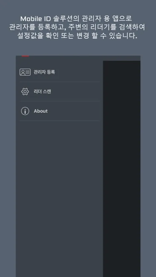 Mobile ID Manager 앱은 스마트 폰의 블루투스 서비스를 활용하여, 출입 리더기와 통신하며, 리더기의 세팅 값을 확인하거나 변경할 수 있습니다.
