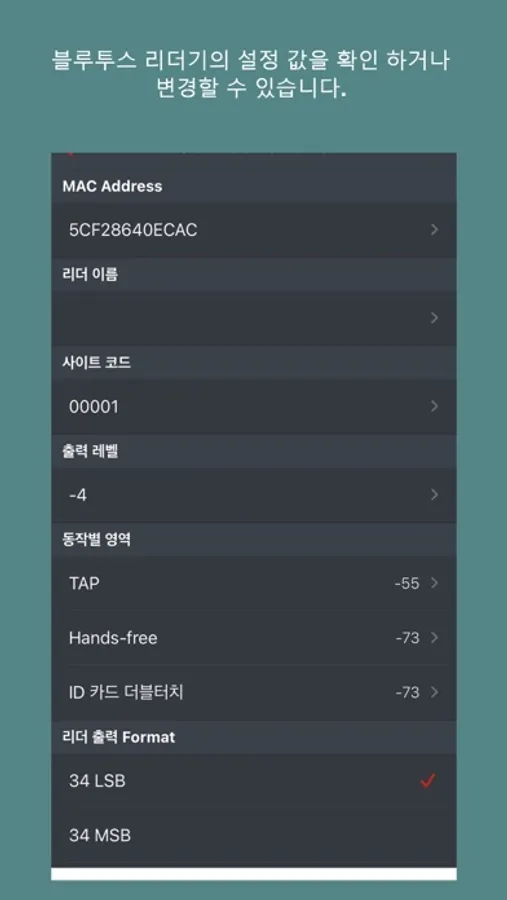 블루투스 리더기의 이름, 사이트 코드, 작동 모드에 따른 신호의 강도, 리더기의 출력 포맷을 확인 및 변경할 수 있습니다.
