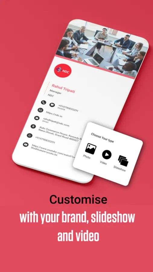 - QR Code - your client can get your digital visiting card by pointing his phone camera onto your QR code by using our in build QR code scanner