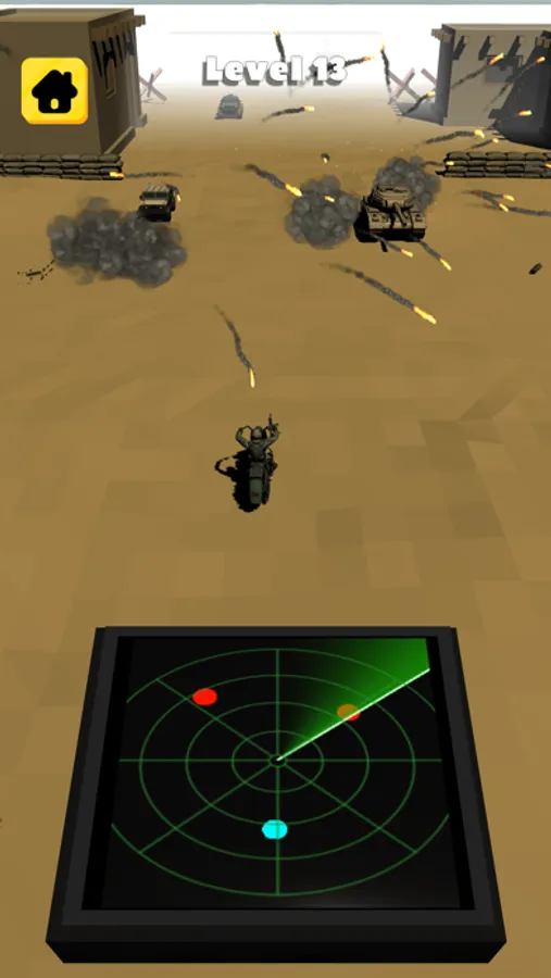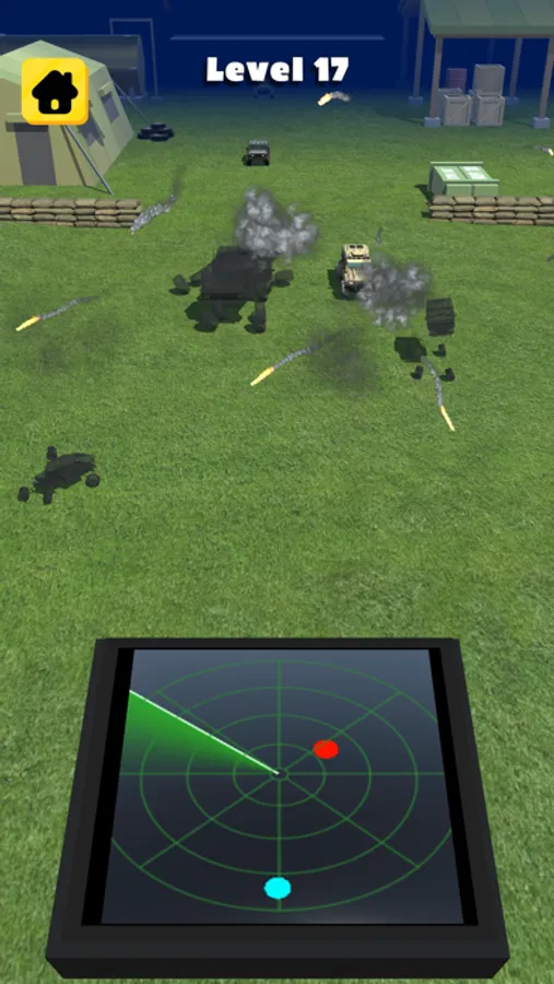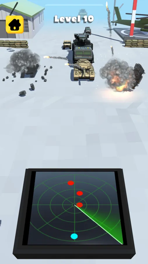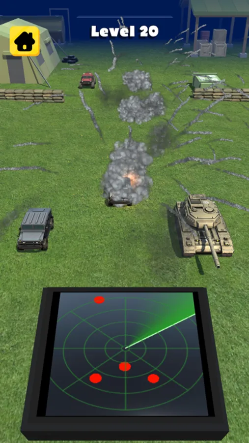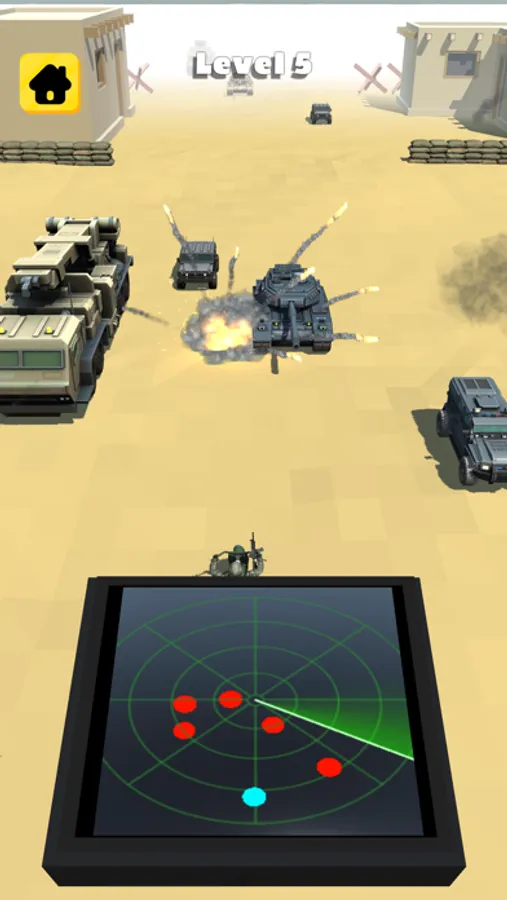 Explode all enemy vechiles using the radar. Don't let anyone pass. Be careful there are many friends on the battlefield!