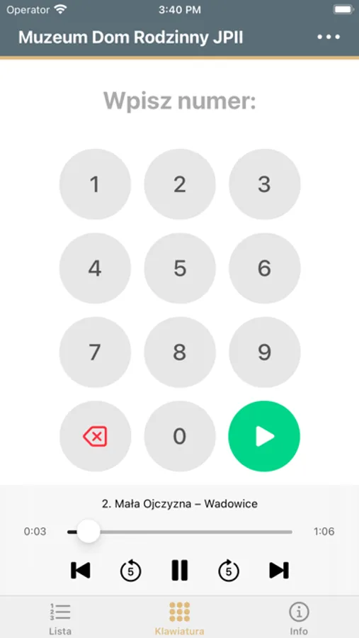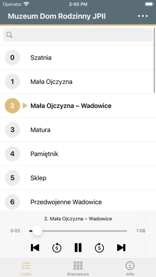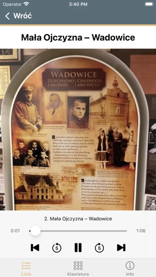 Aplikacja jest formą audioprzewodnika pozwalającego na zwiedzanie Domu Rodzinnego Ojca Świętego Jana Pawła II za pomocą urządzeń mobilnych.