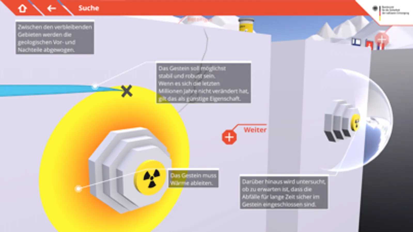 Wohin mit dem Atommüll in Deutschland? In das Weltall schießen? In der App erfahren Sie, was das für Folgen hätte. Deutschland sucht einen sicheren Standort für ein Endlager. Wie läuft die Suche ab und wie kann ich mich beteiligen? Auf diese und viele andere Fragen bekommen Sie hier Antworten. In einem Zwischenlager können Sie sehen, wie die hochradioaktiven Abfälle gegenwärtig gelagert werden und in einem Labor die Wirkung von Radioaktivität erleben.  Steigen Sie in eine Zeitmaschine und schauen Sie, welchen Anforderungen ein Endlager auch in hunderttausenden von Jahren noch standhalten muss.