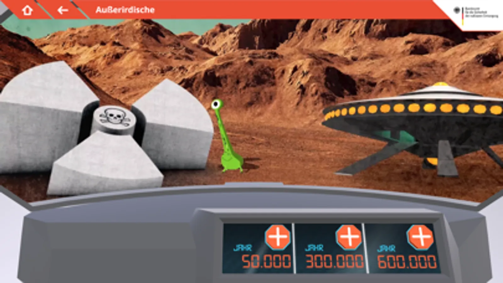 Wohin mit dem Atommüll in Deutschland? In das Weltall schießen? In der App erfahren Sie, was das für Folgen hätte. Deutschland sucht einen sicheren Standort für ein Endlager. Wie läuft die Suche ab und wie kann ich mich beteiligen? Auf diese und viele andere Fragen bekommen Sie hier Antworten. In einem Zwischenlager können Sie sehen, wie die hochradioaktiven Abfälle gegenwärtig gelagert werden und in einem Labor die Wirkung von Radioaktivität erleben. Steigen Sie in eine Zeitmaschine und schauen Sie, welchen Anforderungen ein Endlager auch in hunderttausenden von Jahren noch standhalten muss.
