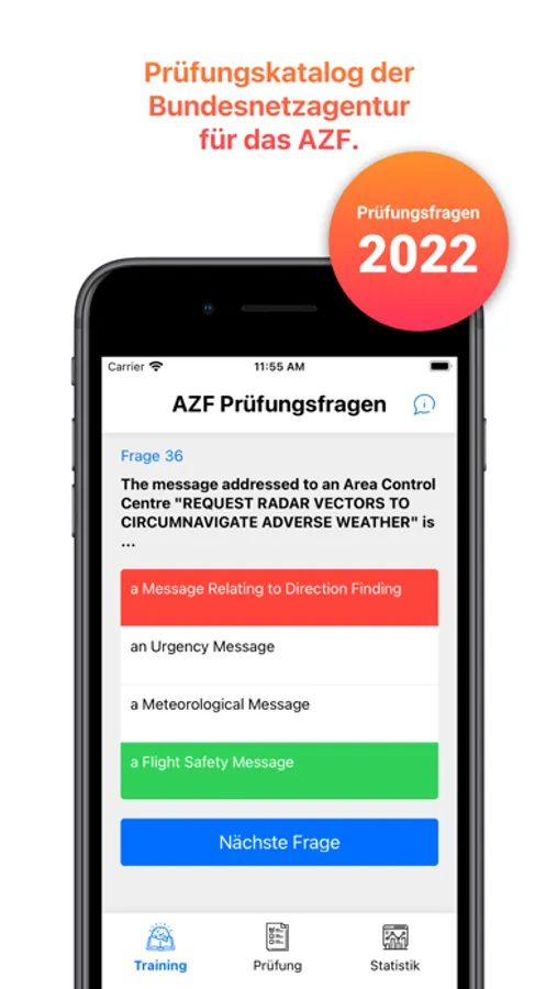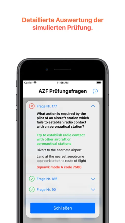 Prüfungskatalog der Bundesnetzagentur für das "Allgemeine Sprechfunkzeugnis für den Flugfunkdienst (AZF)". Der Trainingsmodus in der App erlaubt das Erlernen der 289 Prüfungsfragen. Der simulierte Prüfungsmodus zeigt 40 Fragen aus dem Fragenkatalog an. Im Anschluss an die Prüfung erfolgt eine detaillierte Auswertung.