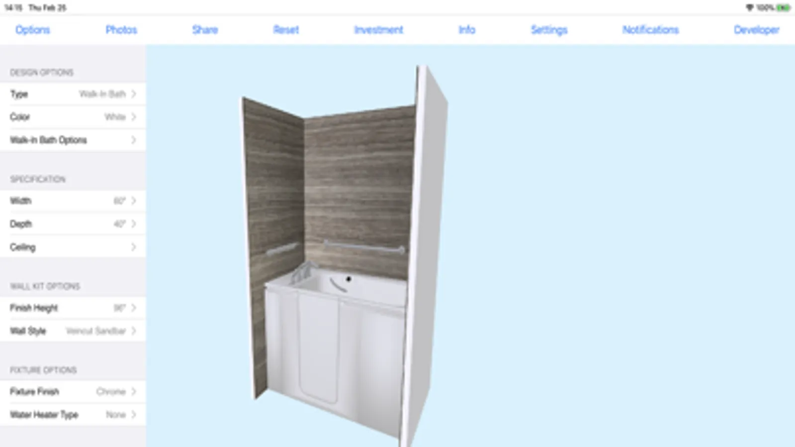 The New Bath Design Studio allows you to show your customer thousands of configurations of baths, showers and other bathroom furniture. You can then adjust the size, colors and specifications to match their exact needs.