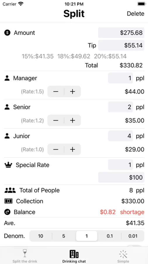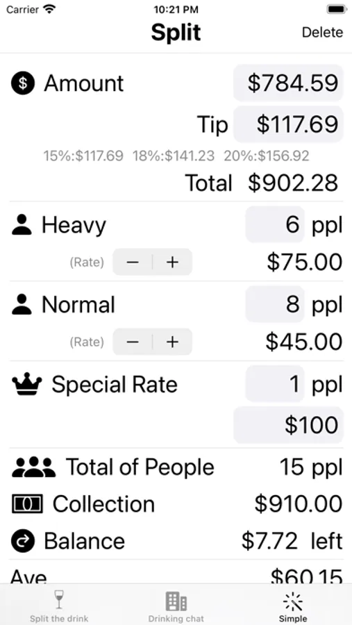 -This mode splits the bill into 4 groups of people who “Hard drink”, “Moderate drink" "Light drink” and “Non drink”.