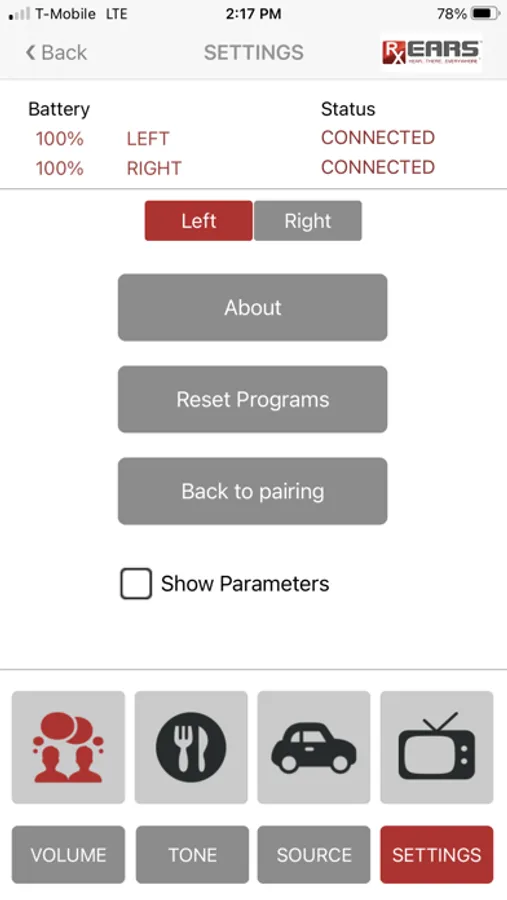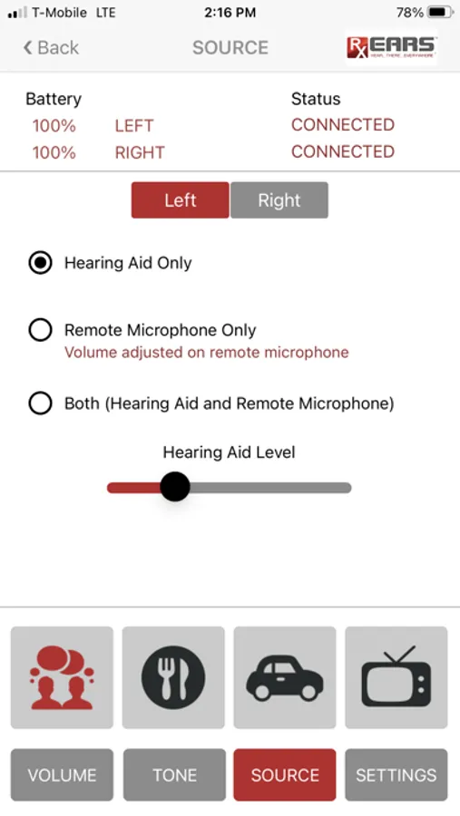 Cell phone app for the RxEars hearing aid. This app can be used to easily control the Bluetooth compatible RxEars hearing devices Rx7 and Rx8.