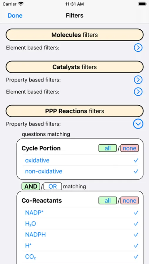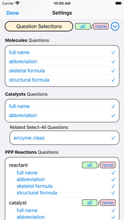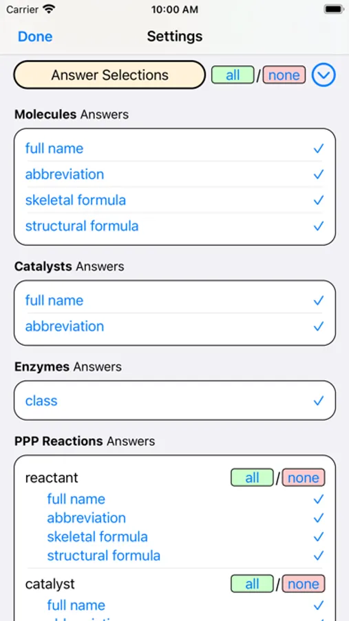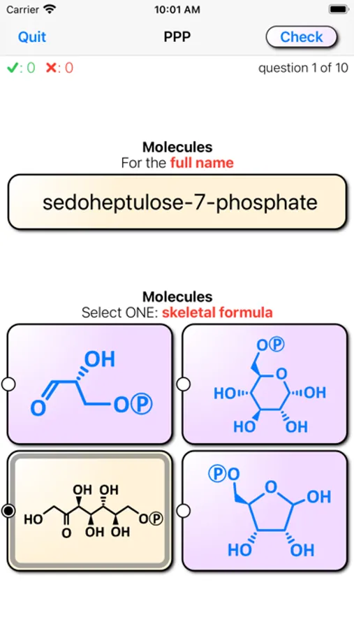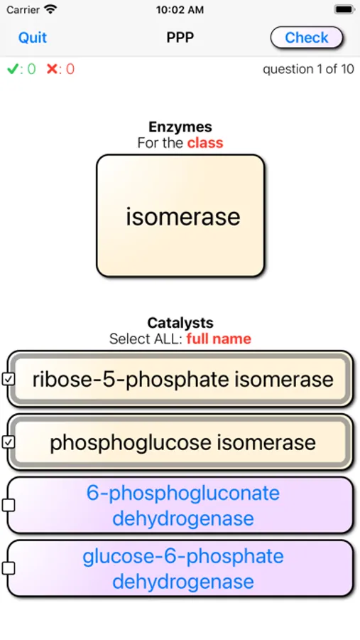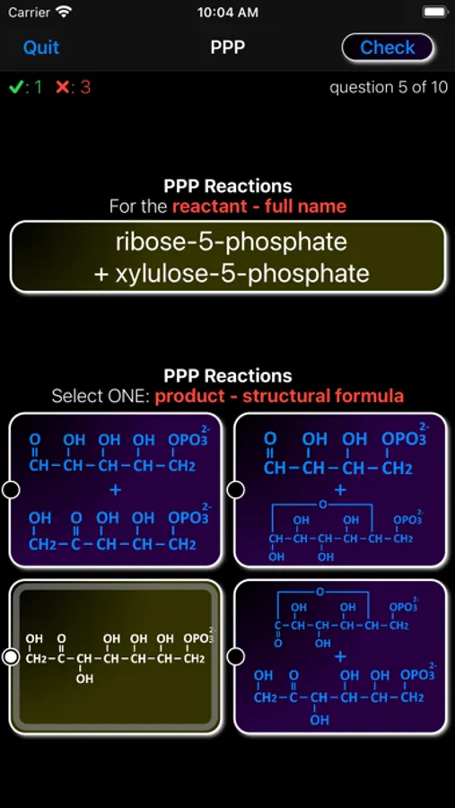 All of this allows you to configure the app to help you quickly learn the pentose phosphate pathway reactions including the reactants, catalysts, products, co-reactants, and by-products. It is an ideal study aid for biology and biochemistry students who need to memorize various portions of this information.