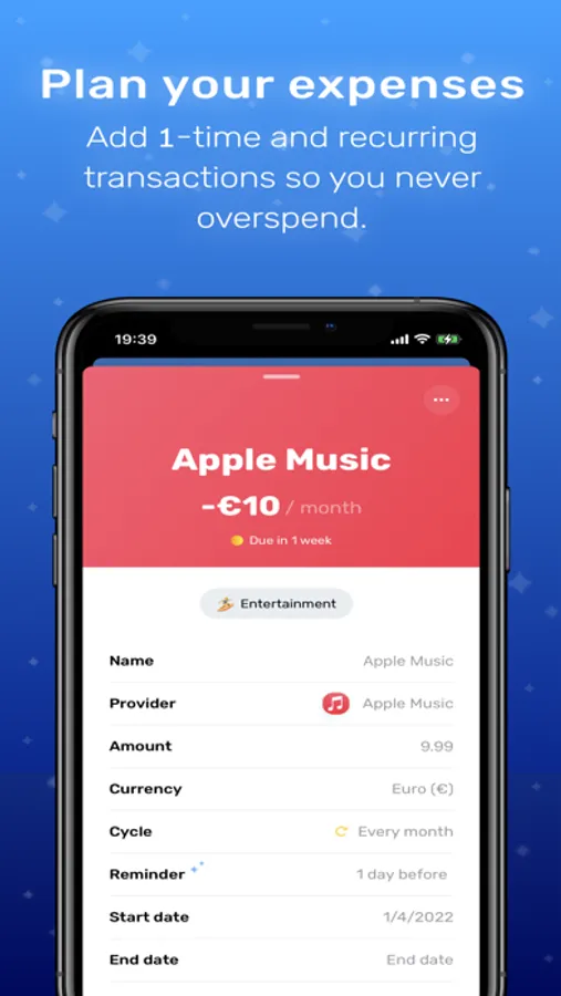 - Add transactions (1-time/recurring, expense, or income)