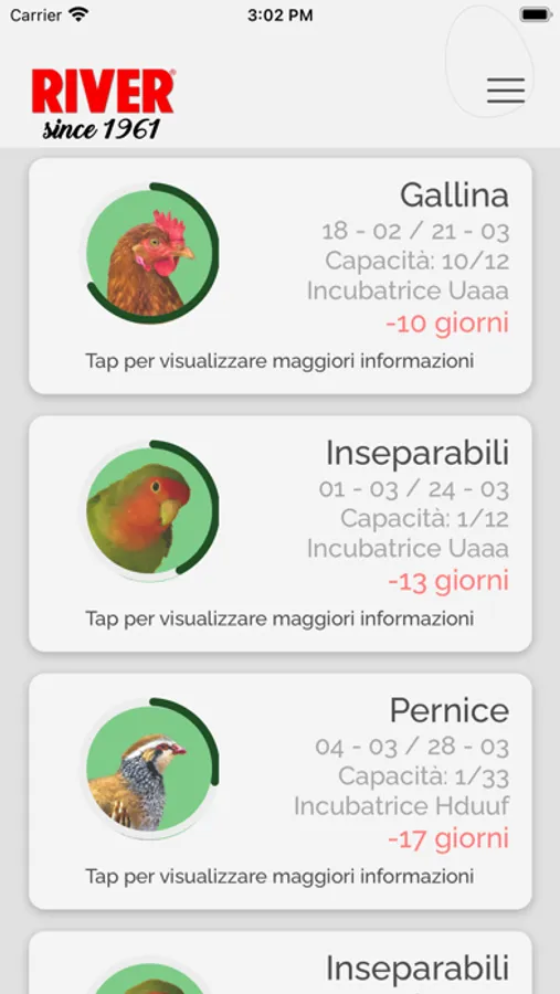With River CovApp you can select the type of incubator, its capacity, the matching accessories, the species to be incubated and the temperature and humidity levels to be set on the machine, but that's not all!