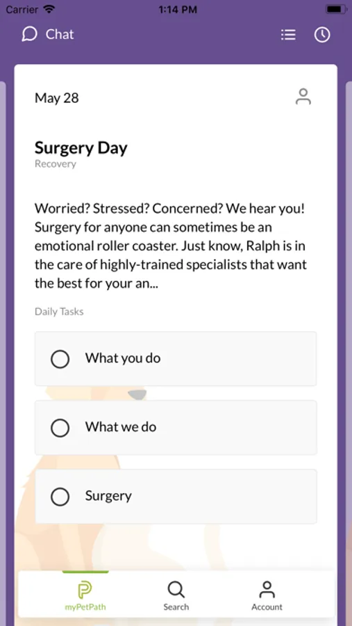 PetPath bridges the gap between veterinarians and pet parents when caring for your pet at home. By using PetPath, you will have access to veterinary-approved education right in the palm of your hand. PetPath will guide you day by day with a few tasks to complete, helping you be an active part of your pet's health care plan.