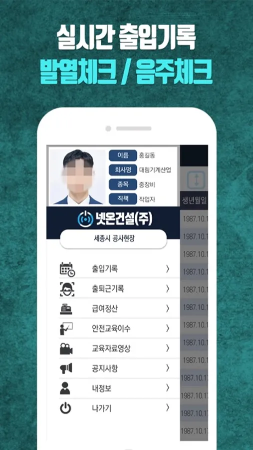 열센서리더기와 안면인식모듈을 탑재한 출입용 게이트를 통과 시에 출입기록 및 발열기록, 음주기록, 출퇴근기록 등이 자동 기록되며 어플을 통해 자신의 출입기록을 조회할수 있습니다.